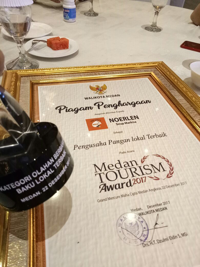 Hallo, pecinta kuliner Medan sobat Noerlen sekalian.., kali ini kami dengan bangga mengumumkan melalui website ini, bahwa Sirup Markisa Noerlen telah dianugerahi sebagai Pengusaha Pangan Lokal Terbaik dalam ajang Medan Tourism Award yang diselenggarakan oleh Pemerintah Kota Medan, melalui Dinas Pariwisata Kota Medan, baru-baru ini.